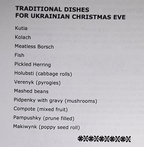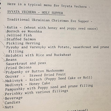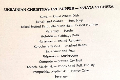 Above is one possible non-Cyrillic spelling of an event known in English as Holy Supper, a feast of twelve dishes traditionally prepared (at least in Canada) by Ukrainian Catholics and Orthodox Christians on Christmas Eve.1 The meal is somewhat similar to the Italian American feast of the seven fishes. It’s a lot of courses, ostensibly excluding meat and dairy, which vary according to the food voice of the particular cook or family, and which blur the line between feasting and fasting.